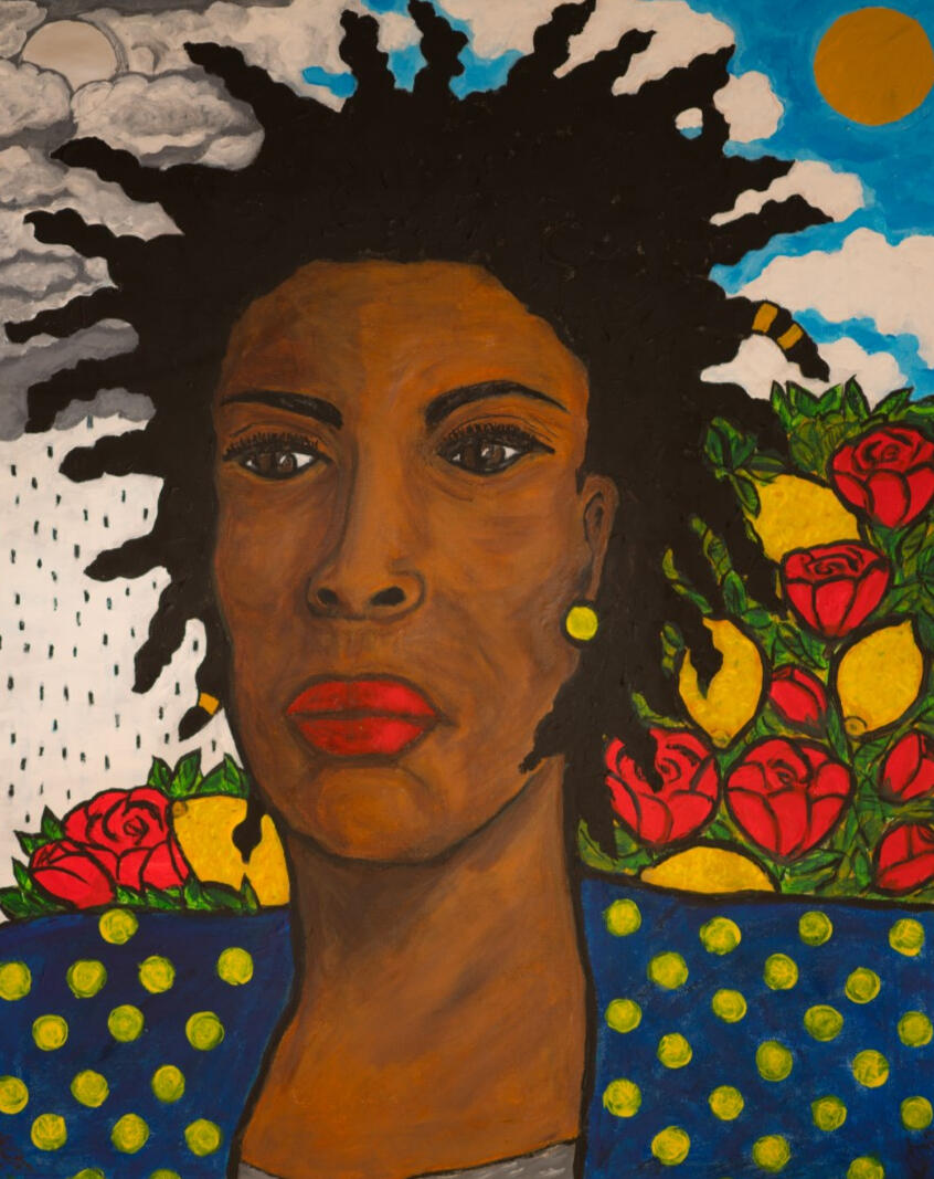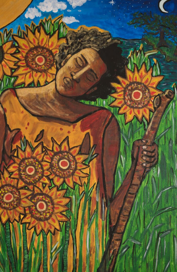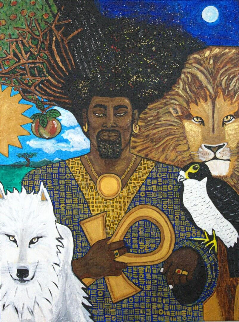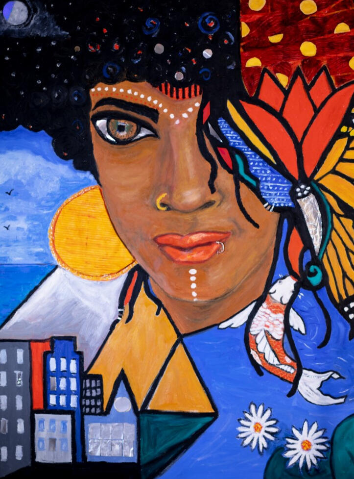 Symbolism of nature, mythology, and cosmic identity — lotus, monarch, and koi woven into natural hair that becomes the night sky; moon and sun together over sea and city, inviting reflection and wonder.