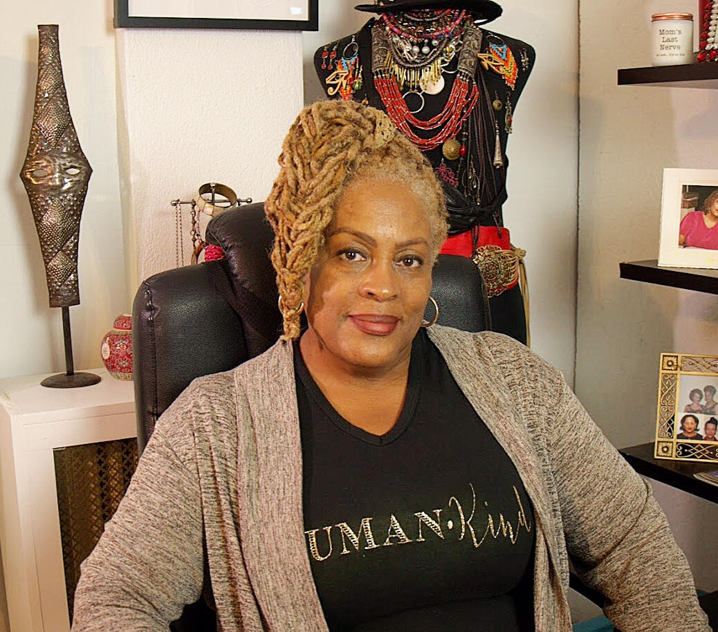 Symbolism of nature, mythology, and cosmic identity — lotus, monarch, and koi woven into natural hair that becomes the night sky; moon and sun together over sea and city, inviting reflection and wonder.